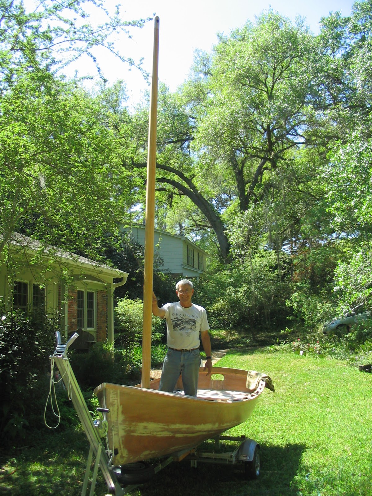 Rolled the boat into the front yard to be clear of overhead tree limbs. We had to sand the base of the mast a little more for it to fit into the mast step, and we had to cut out the opening where the mast fits into the deck a little bit more. Finally the mast fits perfectly!